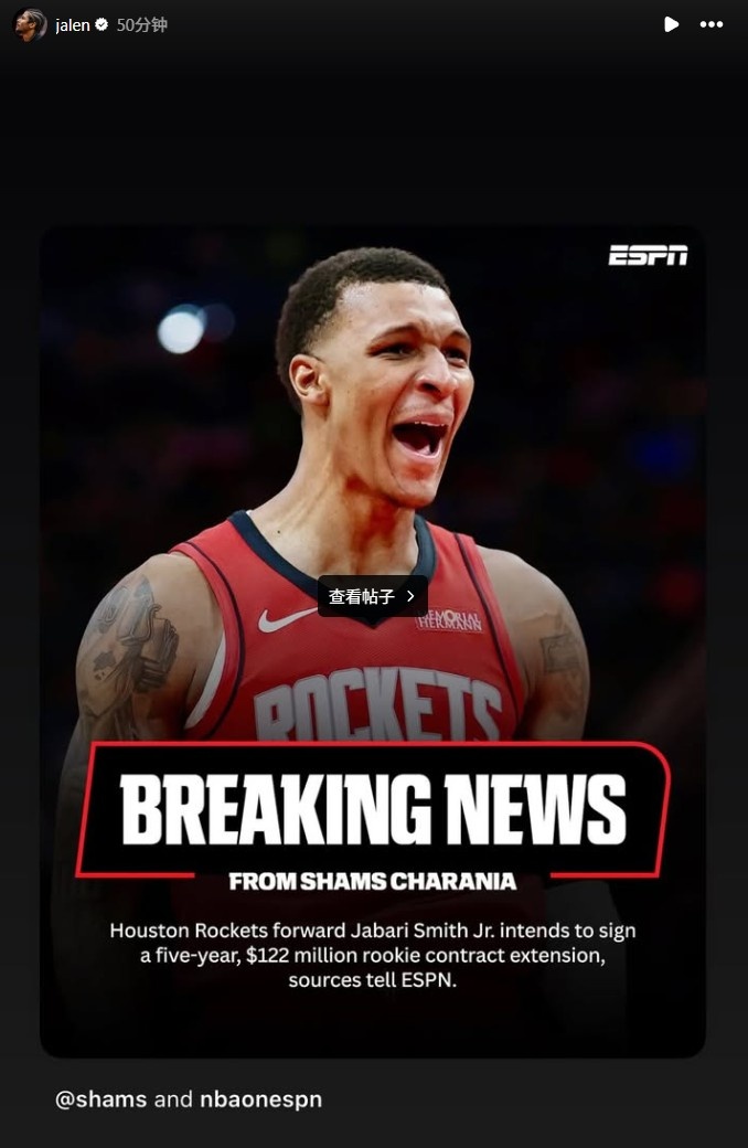 6月30日讯 据ESPN名记Shams Charania报道,多位消息人士透露,小贾巴里-史密斯计划和火箭签下5年1.22亿的提前续约合同。